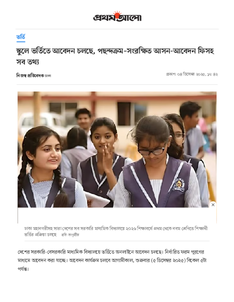 স্কুলে ভর্তিতে আবেদন চলছে, পছন্দক্রম–সংরক্ষিত আসন-আবেদন ফিসহ সব তথ্য.pdf Published on 04 December 2025 Newspaper দৈনিক প্রথম আলো Category Admission / Seat Problem Download