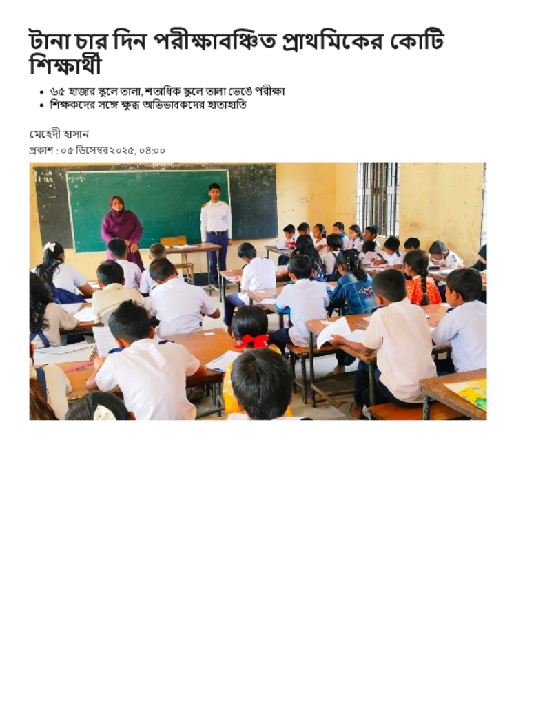 টানা চার দিন পরীক্ষাবঞ্চিত প্রাথমিকের কোটি শিক্ষার্থী.pdf Published on 05 December 2025 Newspaper দৈনিক ইত্তেফাক Category Personal Opinion / Discussion / Commentary General Education Download