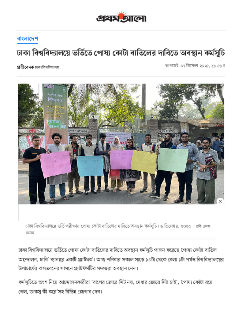 ঢাকা বিশ্ববিদ্যালয়ে ভর্তিতে পোষ্য কোটা বাতিলের দাবিতে অবস্থান কর্মসূচি.pdf Published on 06 December 2025 Newspaper দৈনিক প্রথম আলো Category Admission / Seat Problem General Education Download
