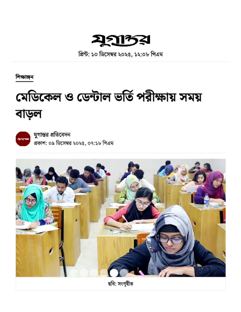 মেডিকেল ও ডেন্টাল ভর্তি পরীক্ষায় সময় বাড়ল.pdf Published on 09 December 2025 Newspaper দৈনিক যুগান্তর Category Professional Education General Education Professional Education Medical Download