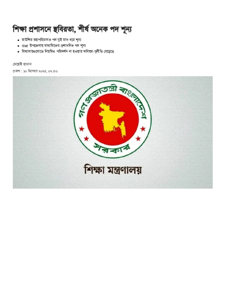 শিক্ষা প্রশাসনে স্থবিরতা, শীর্ষ অনেক পদ শূন্য.pdf Published on 10 December 2025 Newspaper দৈনিক ইত্তেফাক Category Personal Opinion / Discussion / Commentary Download