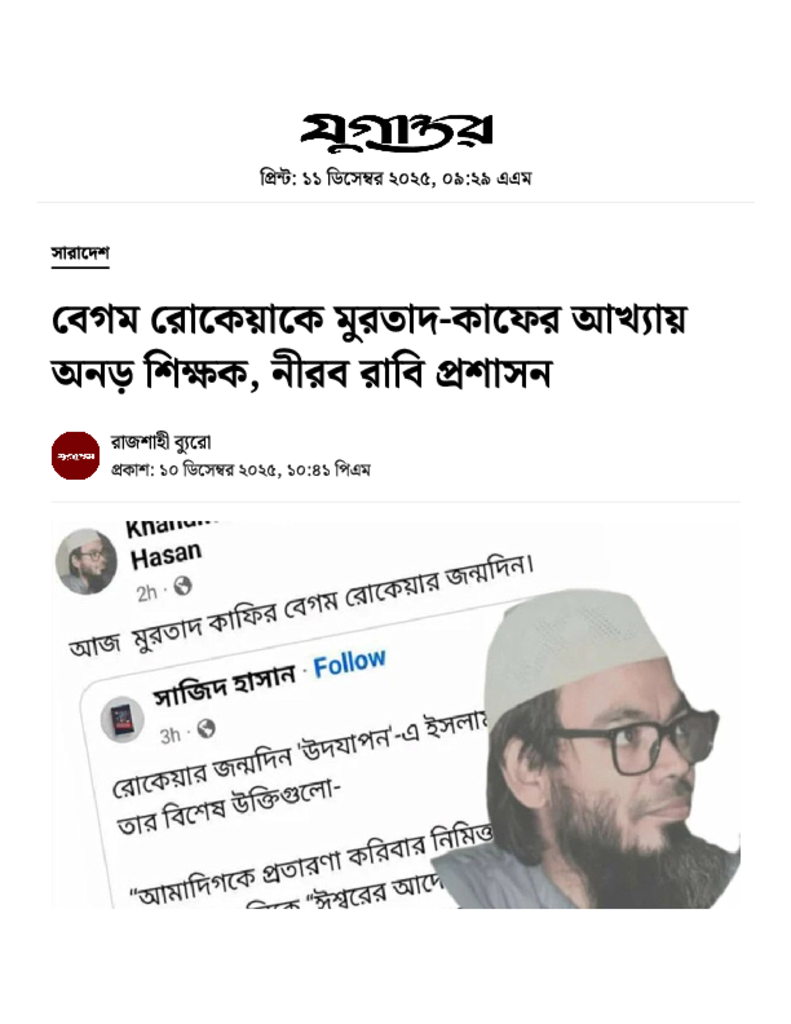 বেগম রোকেয়াকে মুরতাদ-কাফের আখ্যায় অনড় শিক্ষক, নীরব রাবি প্রশাসন.pdf Published on 10 December 2025 Newspaper দৈনিক যুগান্তর Category Personal Opinion / Discussion / Commentary Download