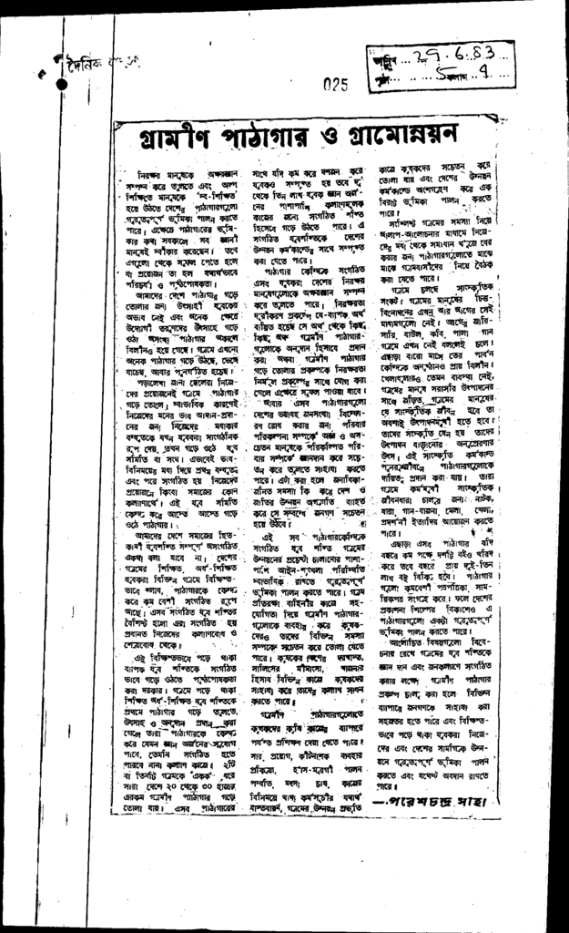 গ্রামীণ পাঠাগার ও গ্রামোন্নয়ন Published on Newspaper দৈনিক বাংলা Category Admission / Seat Problem Download