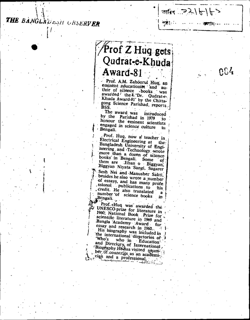 Prof Z Huq gets Qudrat-e-Khuda Award-81 Published on Newspaper The Bangladesh Observer Category Education Policy / Education Commission Download