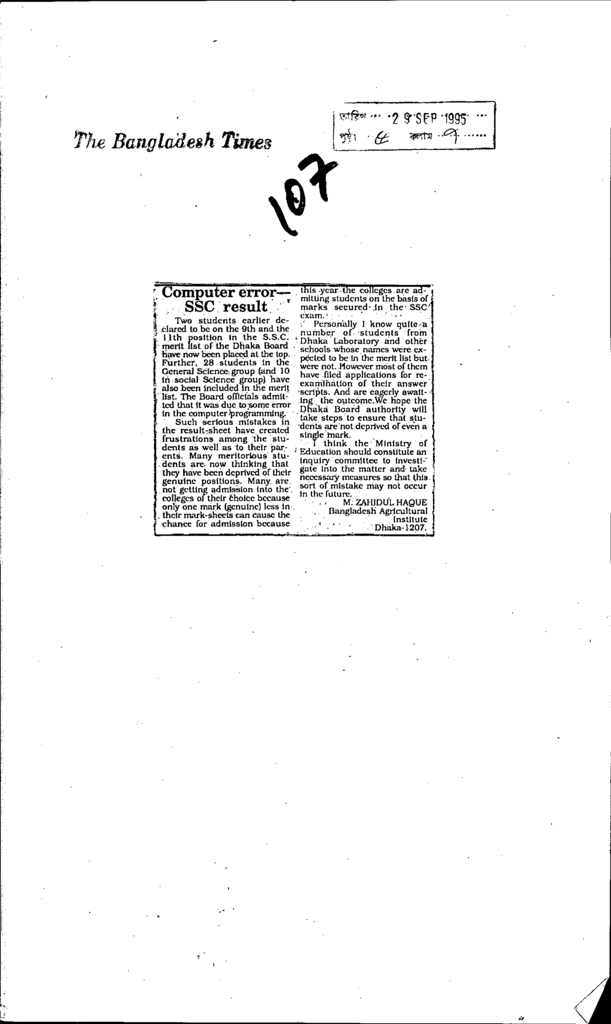 Computer error-ssc result Published on Newspaper The Bangladesh Times Category Personal Opinion / Discussion / Commentary Personal Speech / Discussion / Comentary Secondary and Higher Secondary Education Download