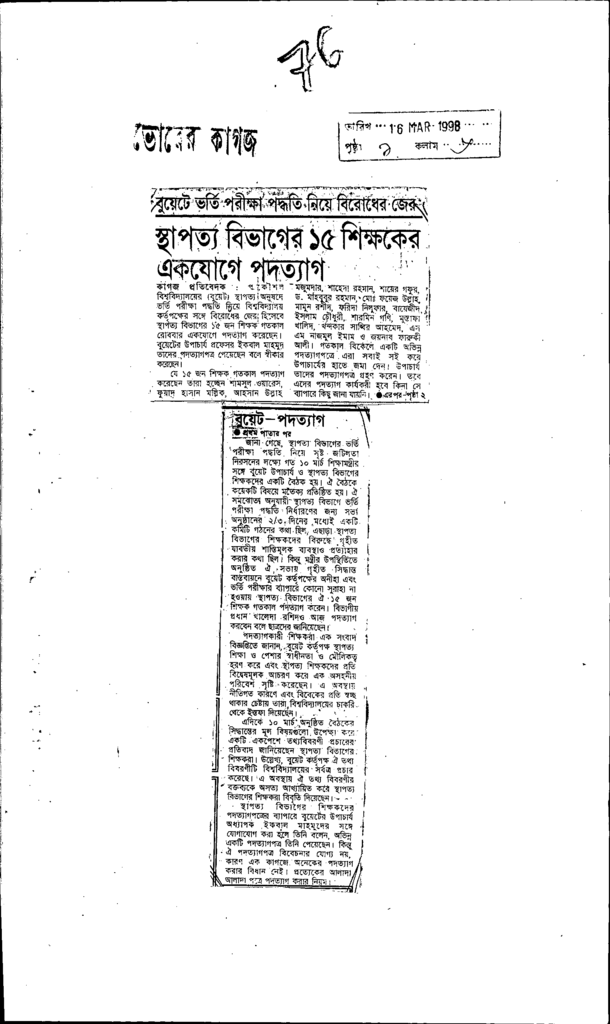 বুয়েটে ভর্তি পরীক্ষা পদ্ধতি নিয়ে বিরোধের জের স্থাপত্যবিভাগের ১৫ শিক্ষকের একযোগে পদত্যাগ Published on Newspaper দৈনিক ভোরের কাগজ Category Professional Education Professional Education Engineering Download
