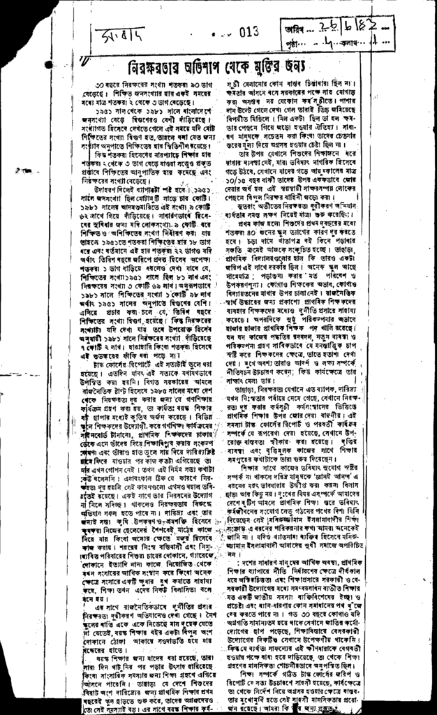 নিরক্ষরতার অভিশাপ মুক্তির জন্য Published on Newspaper দৈনিক সংবাদ Category Sports and Culture Download