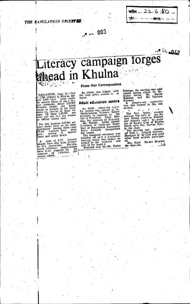 Literacy campaign torges ahead in khulna Published on Newspaper The Bangladesh Observer Category General Education Download