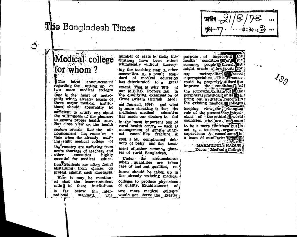 Medical college for whom? Published on Newspaper The Bangladesh Times Category General Education Download
