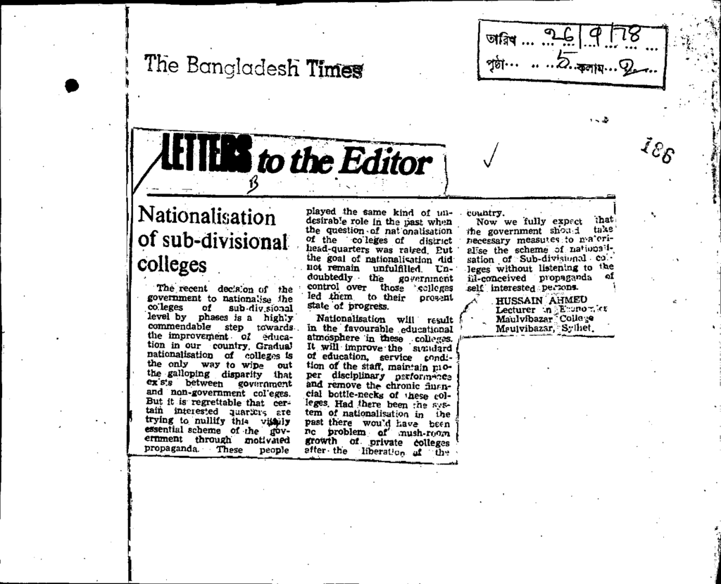 Nationalisation of sub-diviional college Published on Newspaper The Bangladesh Times Category General Education Download