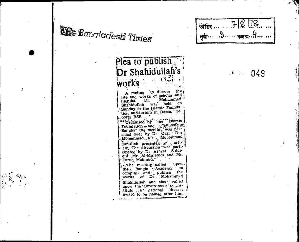 Plea to publish dr shahidullah,s works Published on Newspaper The Bangladesh Times Category General Education Download
