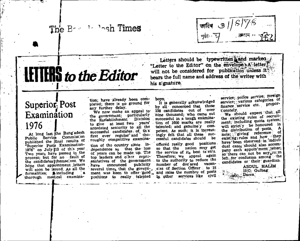 Superior post examination 1976 Published on Newspaper The Bangladesh Times Category General Education Download