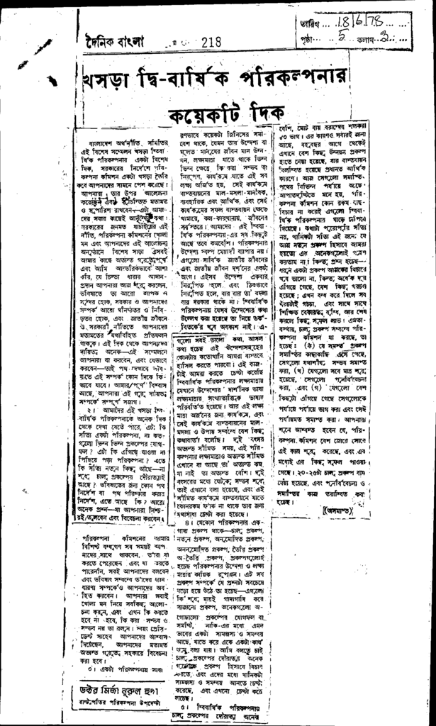 খসড়া দ্বি-বার্ষিক পরিকল্পনার কয়েকটি দিক Published on Newspaper দৈনিক বাংলা Category General Education Download