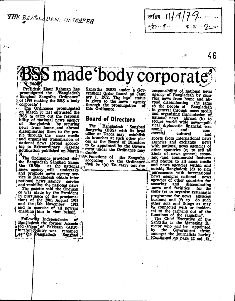Bss made 'body corporate' Published on Newspaper The Bangladesh Observer Category General Education Download