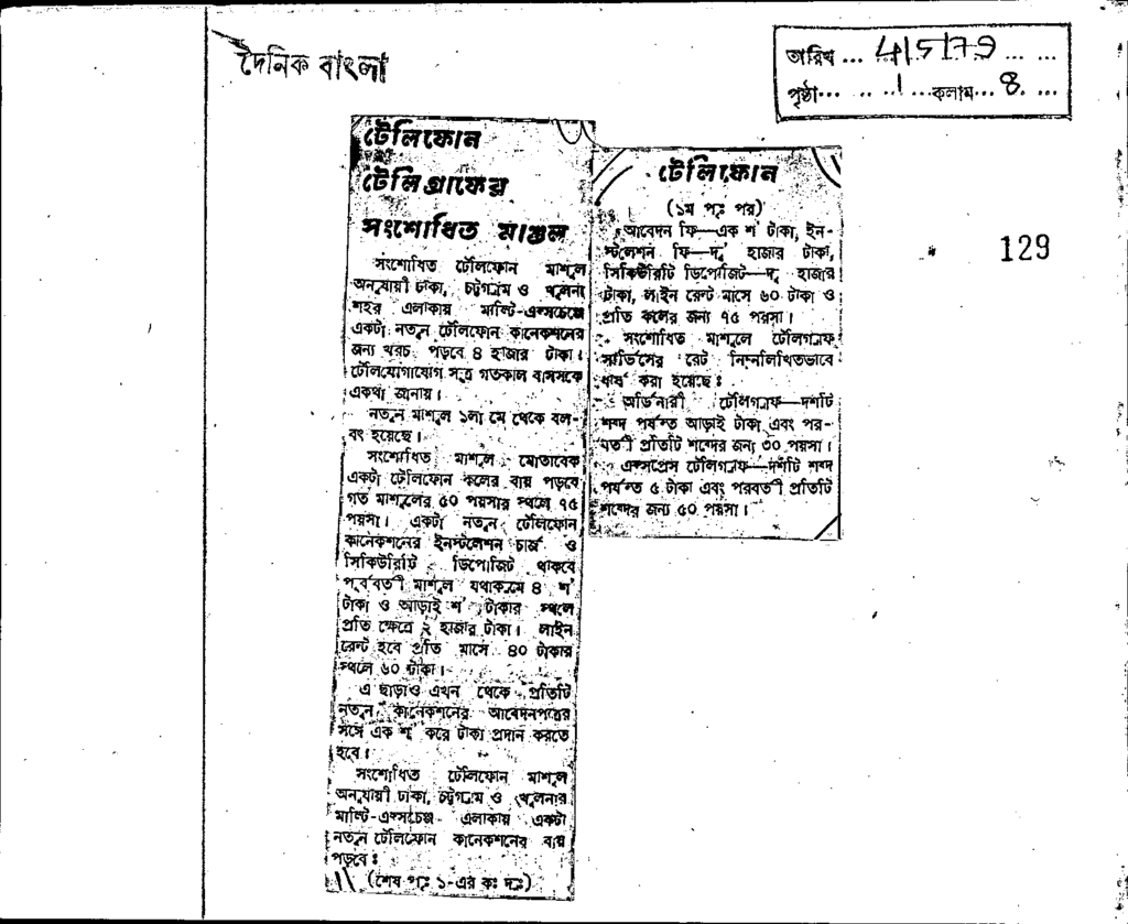 টেলিফোন টেলিগ্রাহকের সংশোধিত মাসুল Published on Newspaper দৈনিক বাংলা Category General Education Download