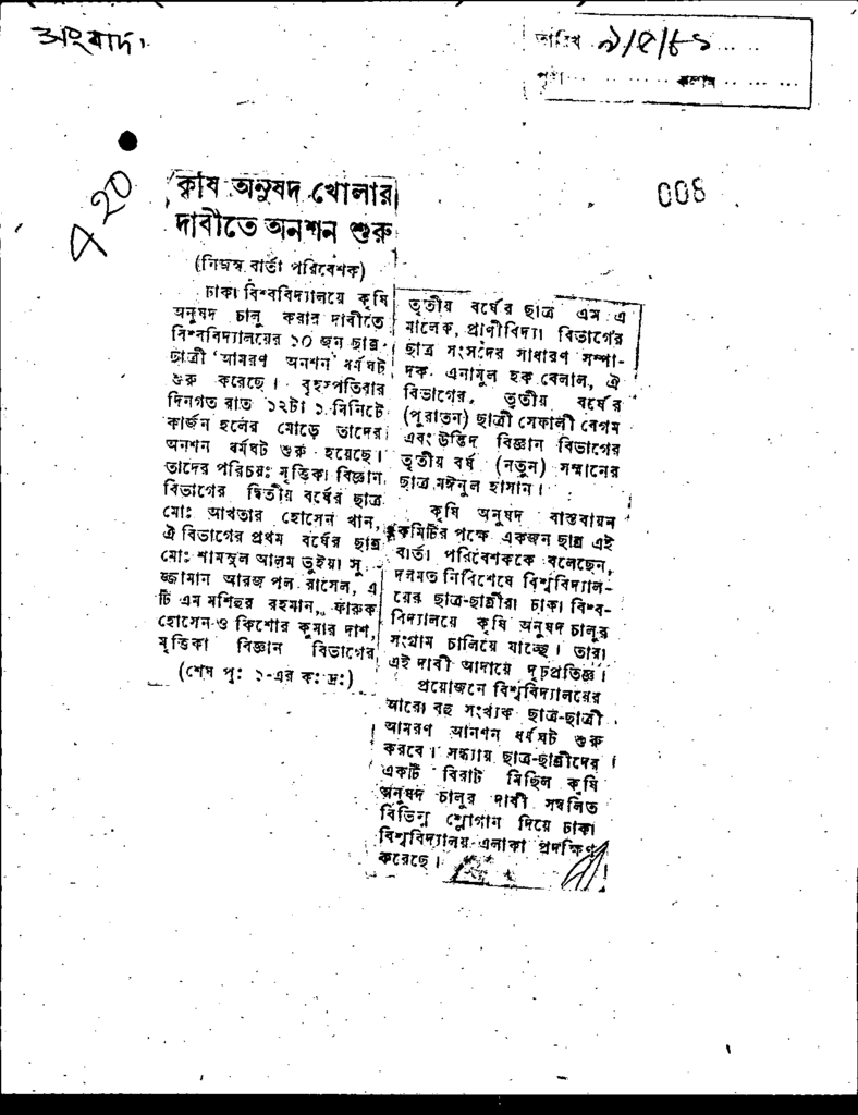 কৃষি অনুষদ খোলার দাবীতে অনশন শুরু Published on Newspaper দৈনিক সংবাদ Category General Education Download