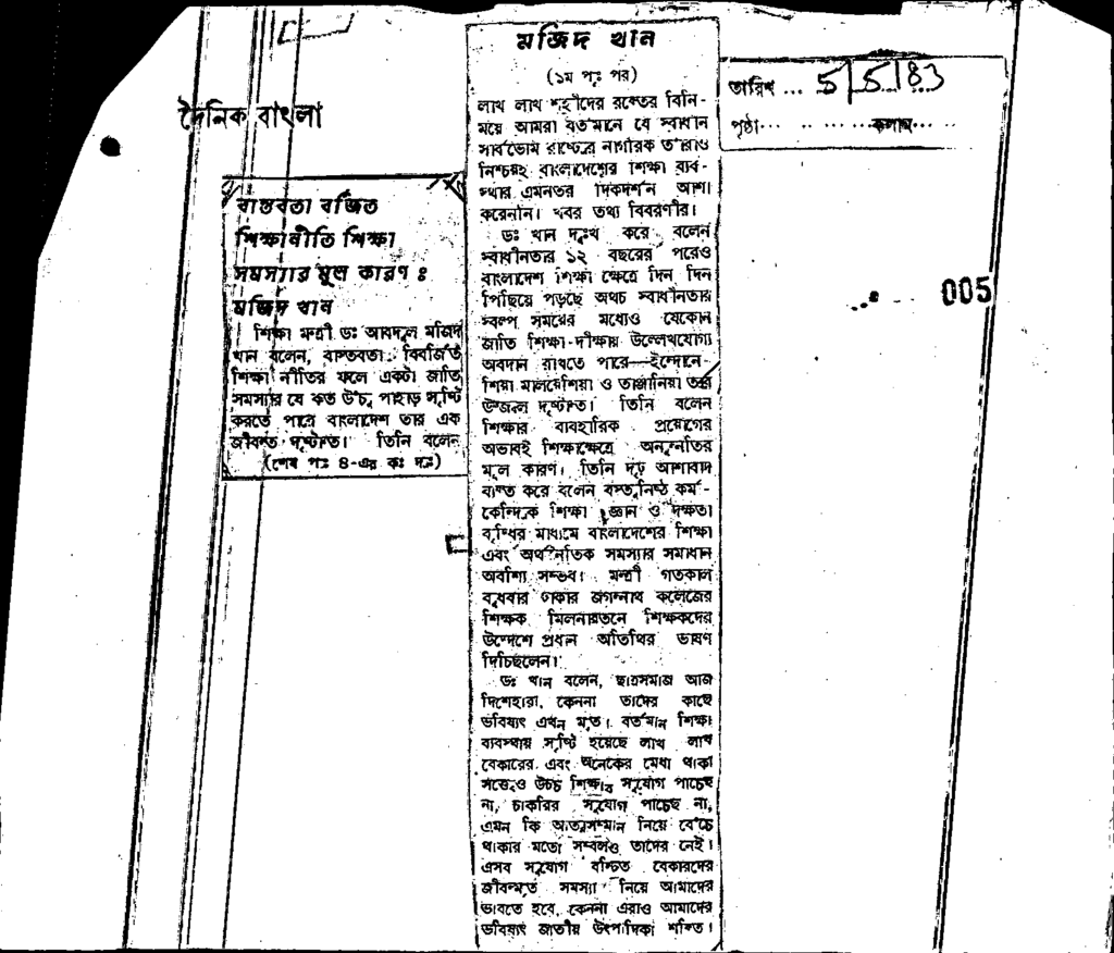 বাস্তবতা বর্জিত শিক্ষানীতিশিক্ষা সমস্যার মূল কারণঃ মজিদ খান Published on Newspaper দৈনিক বাংলা Category Admission / Seat Problem Download