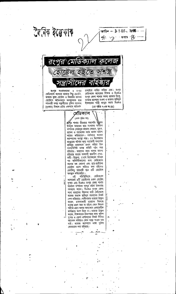 রংপুর মেডিক্যাল কলেজ হোষ্টেল হইতে সশস্ত্র সন্ত্রাসীদের বহিষ্কার Published on Newspaper দৈনিক ইত্তেফাক Category Professional Education Professional Education Medical Download