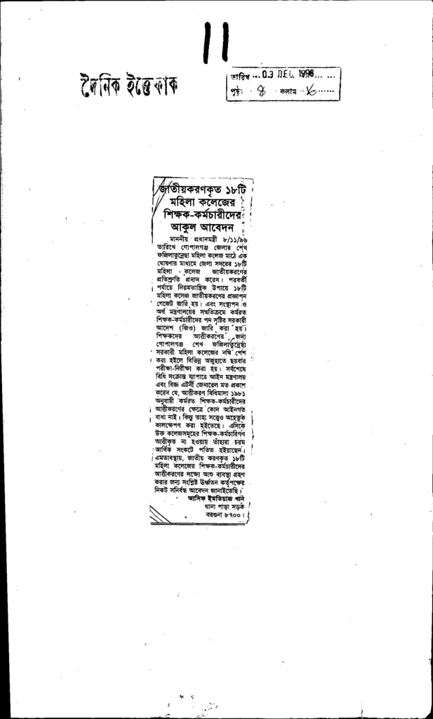 জাতীয়করণকৃত ১৮ টি মহিলা কলেজের শিক্ষক- কর্মচারীদের আকুল আবেদন