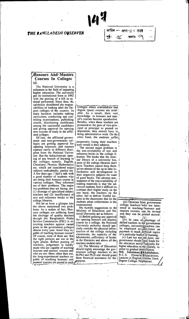 Honours and masters courses in college Published on Newspaper The Bangladesh Observer Category Professional Education Professional Education Others Download