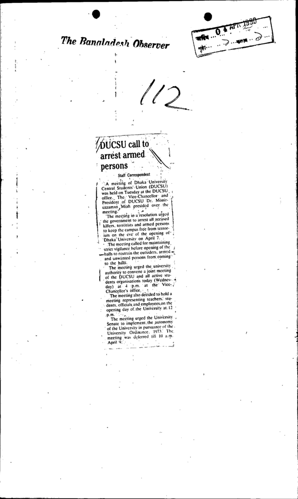 Ducsu call to arrest armed persons Published on Newspaper The Bangladesh Observer Category Education Policy / Education Commission Download