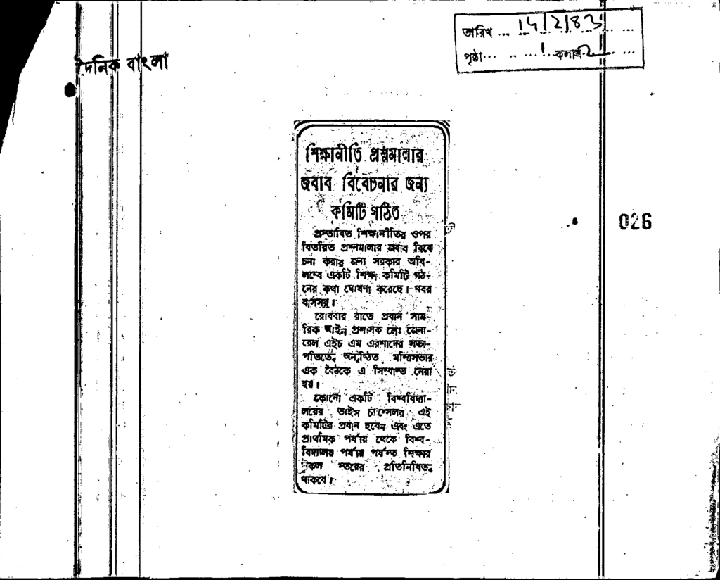 শিক্ষানীতি প্রশ্নমালার জবাব বিবেচনার জন্য কমিটি গঠিত Published on Newspaper দৈনিক বাংলা Category Admission / Seat Problem Download