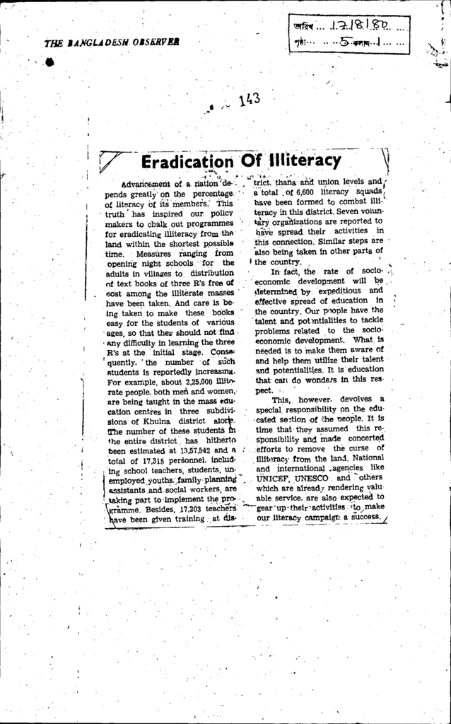 Eradication of illiteracy Published on Newspaper The Bangladesh Observer Category Educational Ministry / Departments Education Ministry / Division / Directorate Download