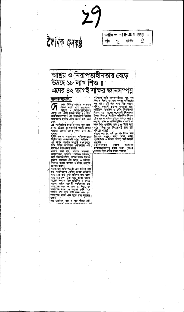আশ্রয় ও নিরাপত্তাহীনতায় বেড়ে উঠছে ১৮ লাখ শিশু।। এদের ৪২ ভাগই সাক্ষর জ্ঞানসম্পন্ন Published on Newspaper দৈনিক জনকণ্ঠ Category Educational Ministry / Departments Education Ministry / Division / Directorate Download