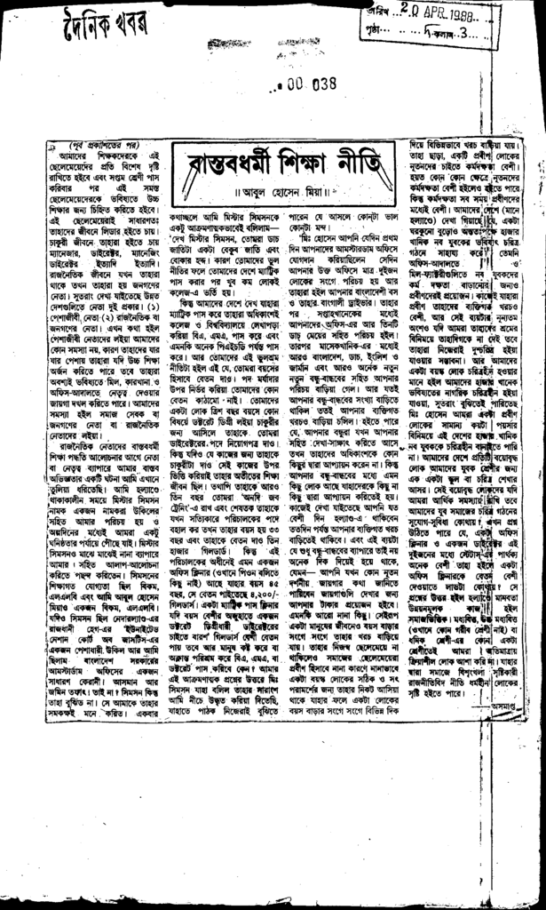 বাস্তবধর্মী শিক্ষা নীতি Published on Newspaper দৈনিক খবর Category Personal Opinion / Discussion / Commentary Download