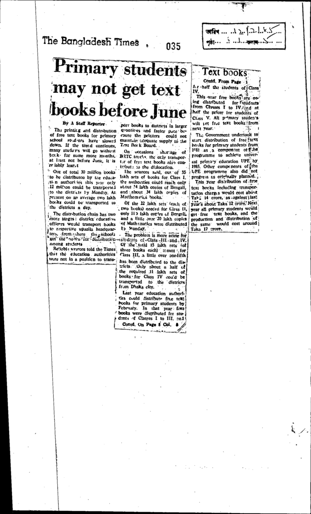 Primary students may not get text books before june Published on Newspaper The Bangladesh Times Category Educational Ministry / Departments Education Board NCTB Education Ministry / Division / Directorate Download