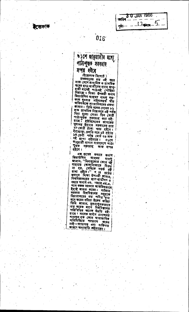 ৩১ শে জানুয়ারীর মধ্যে পাঠ্যপুস্তক সরবরাহ সম্পন্ন হইবে Published on Newspaper দৈনিক ইত্তেফাক Category Educational Ministry / Departments Education Board NCTB Education Ministry / Division / Directorate Download