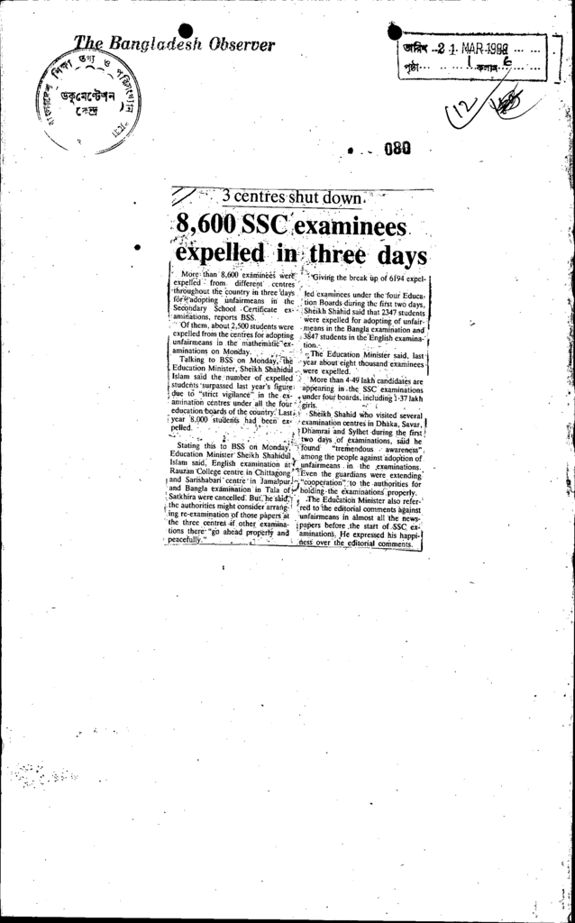 8,600 ssc examinees expelled in three days Published on Newspaper The Bangladesh Observer Category Public Examination Public Examination SSC Download