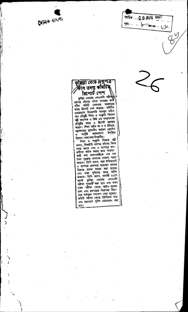 কুমিল্লা বোর্ড প্রশ্নপত্র ফাঁস তদন্ত কমিটির রিপোর্ট পেশ Published on Newspaper দৈনিক বাংলা Category Public Examination Public Examination SSC Download