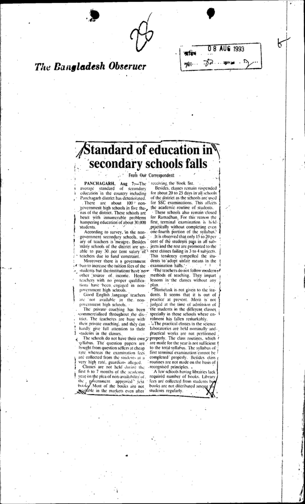 Standard of education in secondary schools falls Published on Newspaper The Bangladesh Observer Category Public Examination Public Examination SSC Download