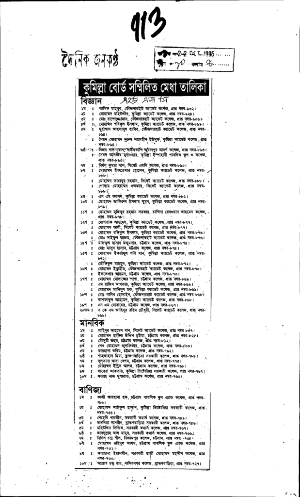 কুমিল্লা বোর্ড সম্মিলিত মেধা তালিকা