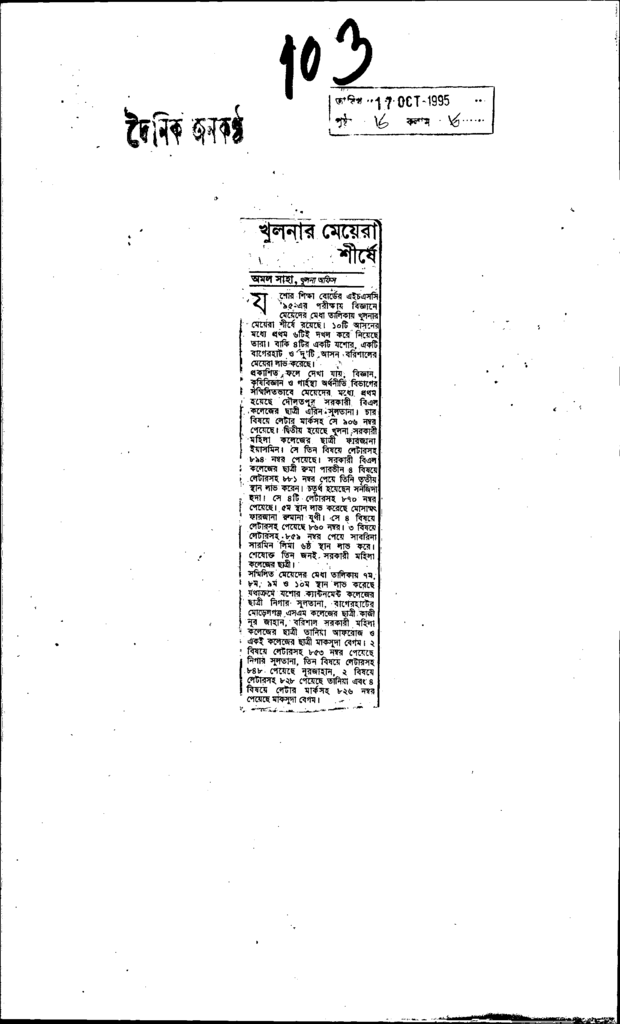 খুলনার মেয়েরা শীর্ষে Published on Newspaper দৈনিক জনকণ্ঠ Category Public Examination Public Examination SSC Download