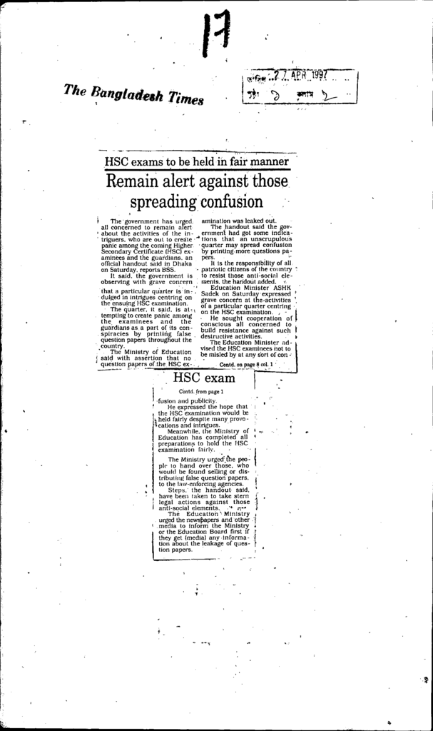 Remain alert against those spreading confusion Published on Newspaper The Bangladesh Times Category Public Examination Public Examination SSC Download