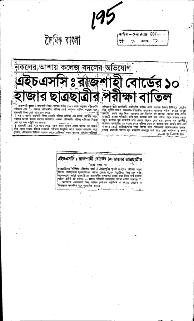 এইচএসসিঃ রাজশাহী বোর্ডের 10 হাজার ছাত্রছাত্রীর পরীক্ষা বাতিল Published on Newspaper দৈনিক বাংলা Category Public Examination Public Examination SSC Download