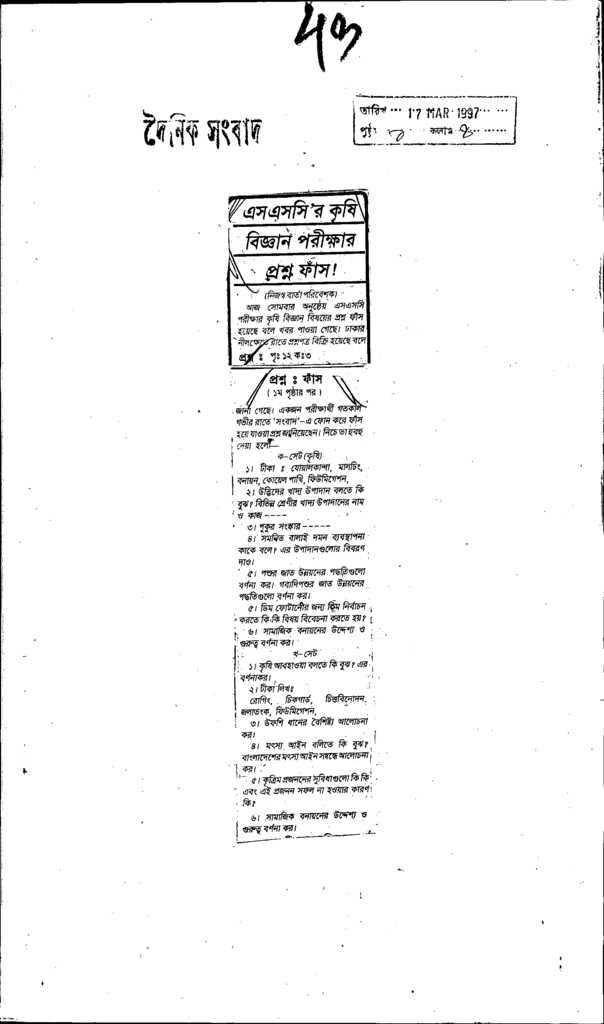এসএসসি’র কৃষি বিজ্ঞান পরীক্ষার প্রশ্ন ফাঁস! Published on Newspaper দৈনিক সংবাদ Category Public Examination Public Examination SSC Download