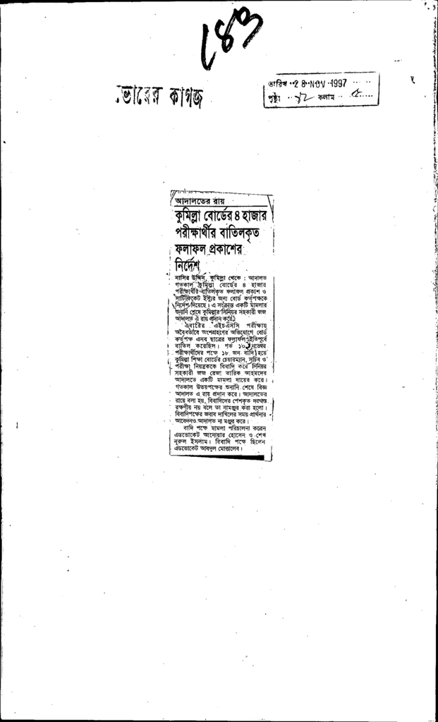 কুমিল্লা বোর্ডের 4 হাজার পরীক্ষার্থীর বাতিলকৃত ফলাফল প্রকাশের নির্দেশ Published on Newspaper দৈনিক ভোরের কাগজ Category Public Examination Public Examination SSC Download