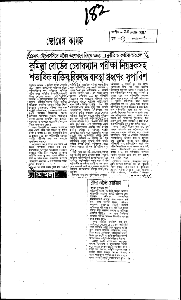 কুমিল্লা বোর্ডের চেয়ারম্যান পরীক্ষা নিয়ন্ত্রকসহ শতাধিক ব্যাক্তর বিরুদ্ধে ব্যবস্থা গ্রহণের সুপারিশ Published on Newspaper দৈনিক ভোরের কাগজ Category Public Examination Public Examination SSC Download