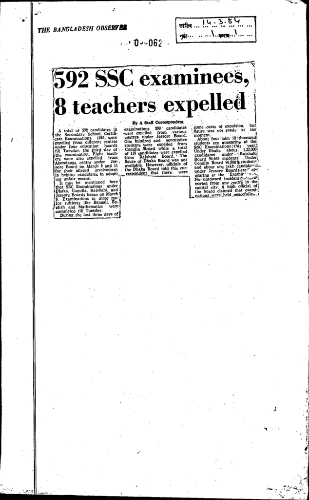 592 ssc examinees, 8 teachers expelled Published on Newspaper The Bangladesh Observer Category Public Examination Public Examination Others Download