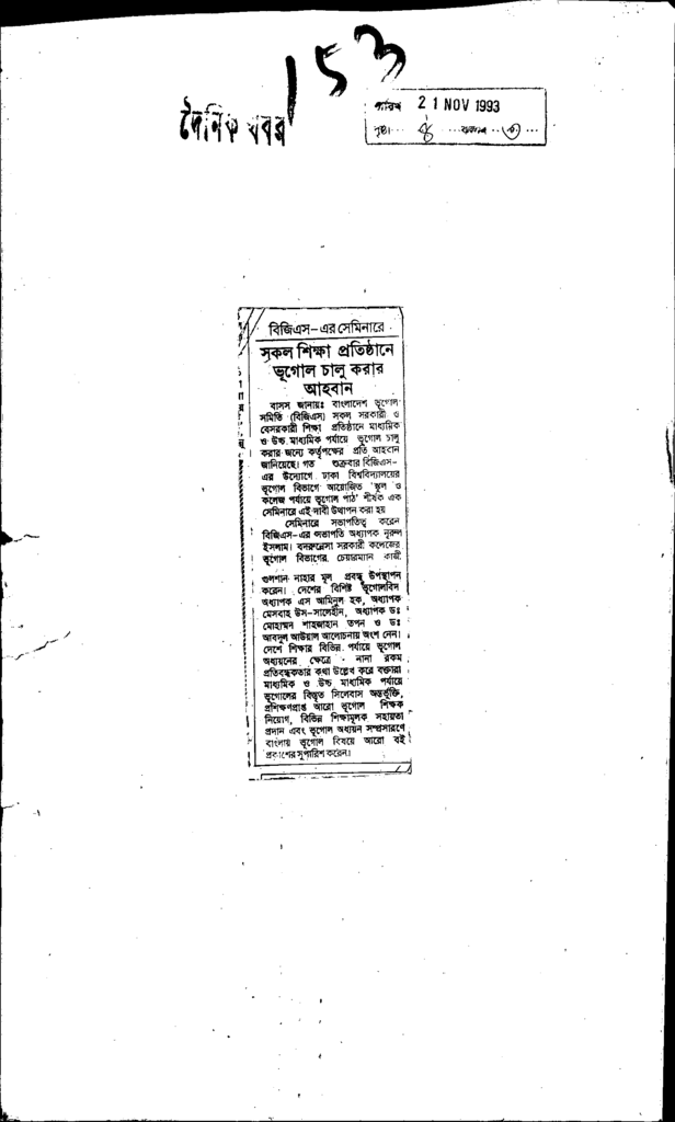 সকল শিক্ষা প্রতিষ্ঠানে ভূগোল চালু করার আহবান Published on Newspaper দৈনিক খবর Category General Education Download