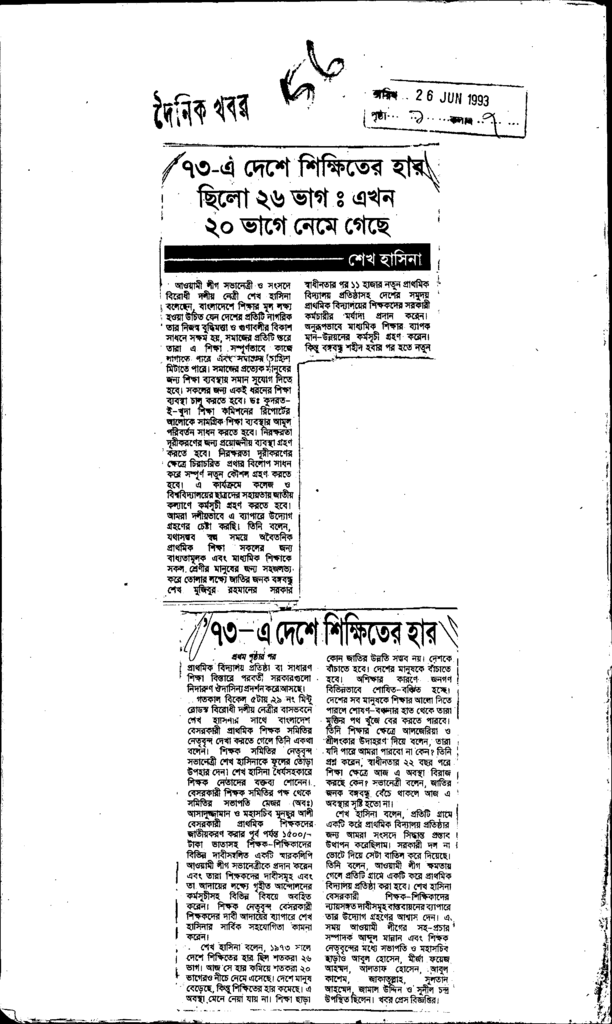 ৭৩-এ দেশের শিক্ষিতের হার ছিল ২৬ ভাগ,এখন ২০ ভাগে নেমে গেছেঃ--শেখ হাসিনা Published on Newspaper দৈনিক খবর Category General Education Download