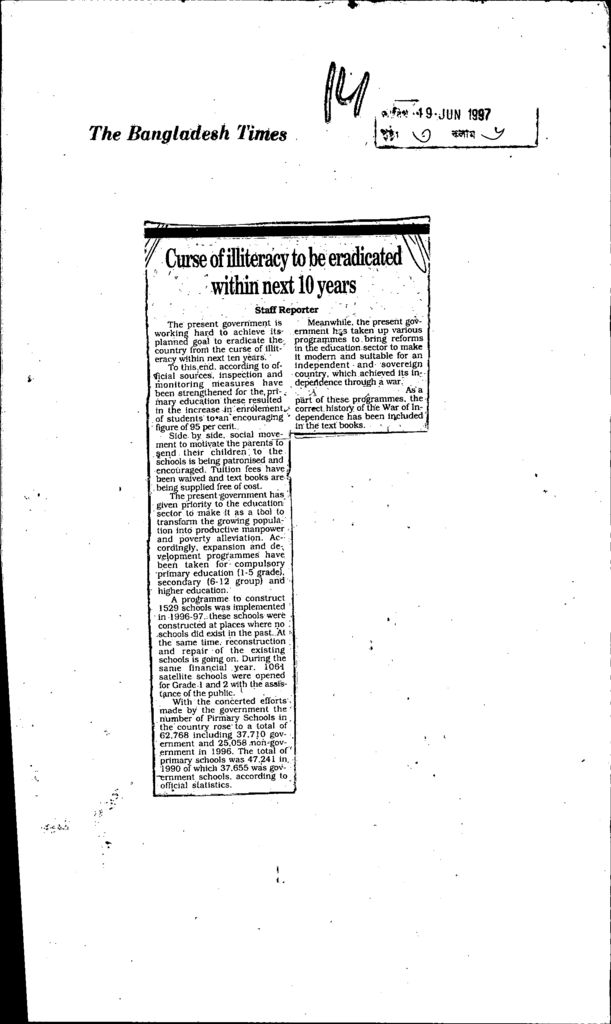 Curse of lilliteracy to be eadicated within next 10 years Published on Newspaper The Bangladesh Times Category General Education Download