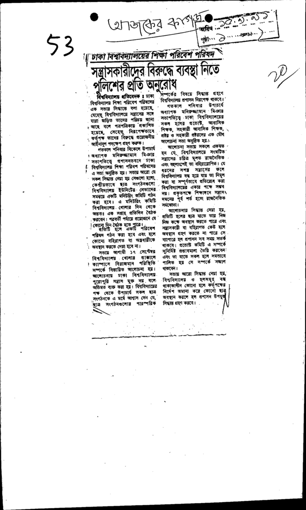 সনত্রাসকারীদের বরিুদ্ধে ব্যবস্থা নিতে পুলিশের প্রতি অনুরোধ Published on Newspaper দৈনিক আজকের কাগজ Category General Education Download