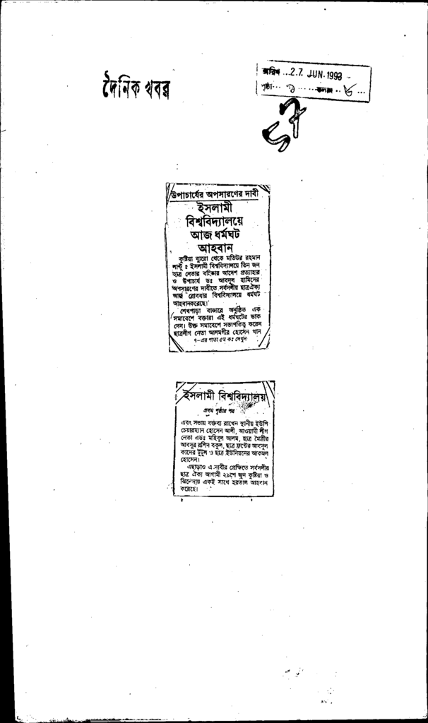 ইসলামী বিশ্ববিদ্যালয়ে আজ ধর্মঘট আহবান Published on Newspaper দৈনিক খবর Category General Education Download