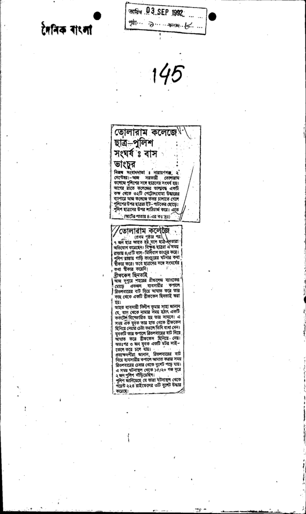তোলারাম করেজে ছাত্র পুলিশ সংঘর্ষ বাস ভাংচুর Published on Newspaper দৈনিক বাংলা Category Campus Terrorism Download