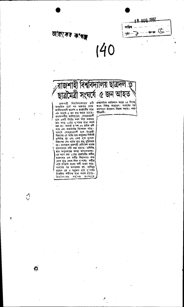 রাজশাহী বিশ্ববিদ্যালয় ছাত্রদল ও ছাত্রমৈত্রী সংঘর্ষ ৫ জন আহত Published on Newspaper দৈনিক আজকের কাগজ Category Campus Terrorism Download