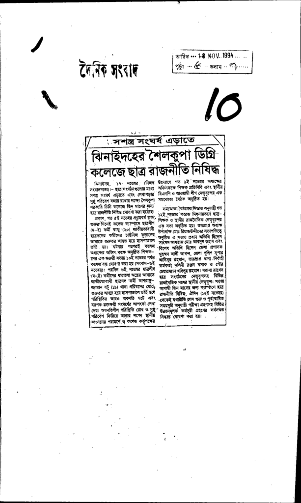 সশস্ত্র সংঘর্ষ এড়াতে জিনাইদহের শে/লকুপা ডিগ্রি কলেজে ছাত্র রাজনীতি নিষিদ্ধ Published on Newspaper দৈনিক সংবাদ Category Campus Terrorism Download